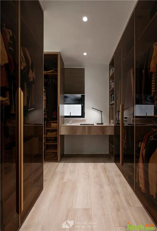 The cloakroom has the functions of clothing storage and dressing. All cabinet doors are made of glass instead of solid doors, which is convenient for clothing handling. The cabinet doors are decorated with gold lines, presenting a simple and gorgeous reconciliation.