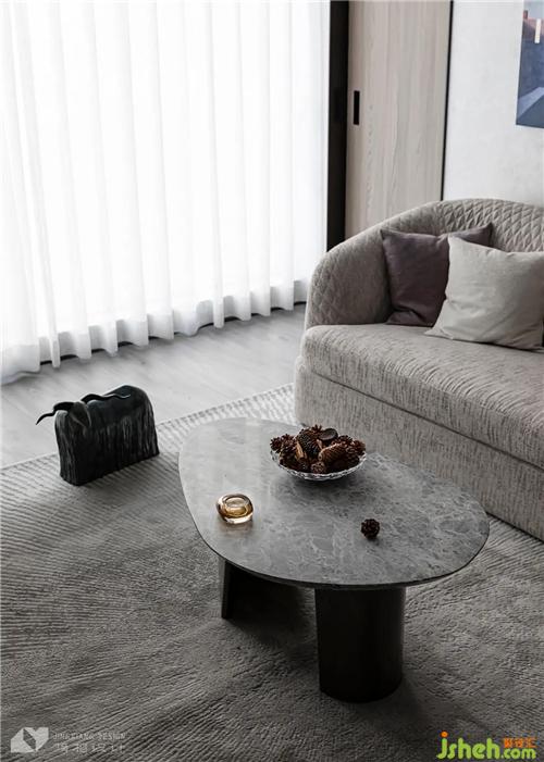 以低飽和的灰白為基調(diào),營造出休閑、舒適的空間氛圍,令情緒悄然放松。將規(guī)整石材嵌入靈動木格柵,剛?cè)岵?,充實了局部空間內(nèi)涵。