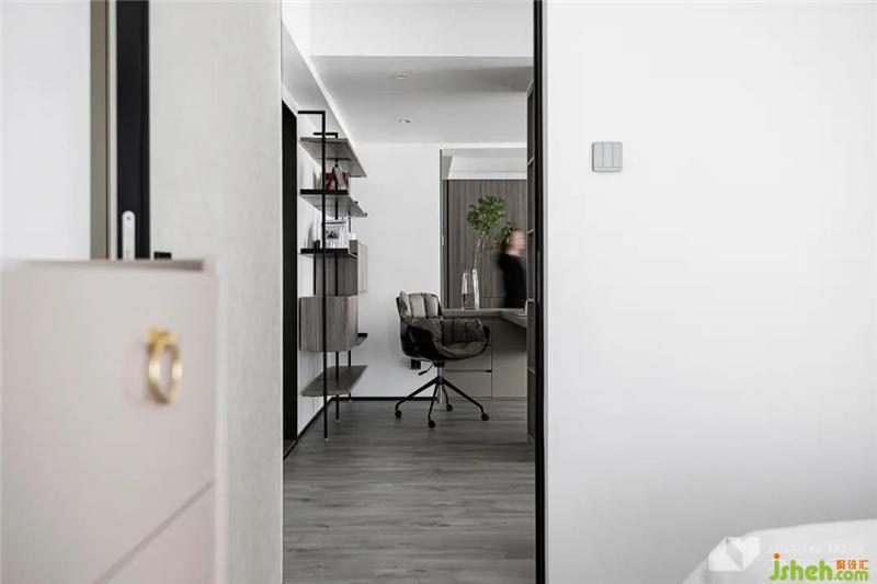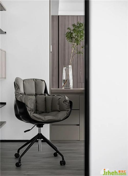 利用L型書(shū)桌,巧妙劃分出空間界線,營(yíng)造書(shū)房私密感。開(kāi)放式書(shū)柜,造型輕盈,與開(kāi)放格局深度融合,形成整體感。