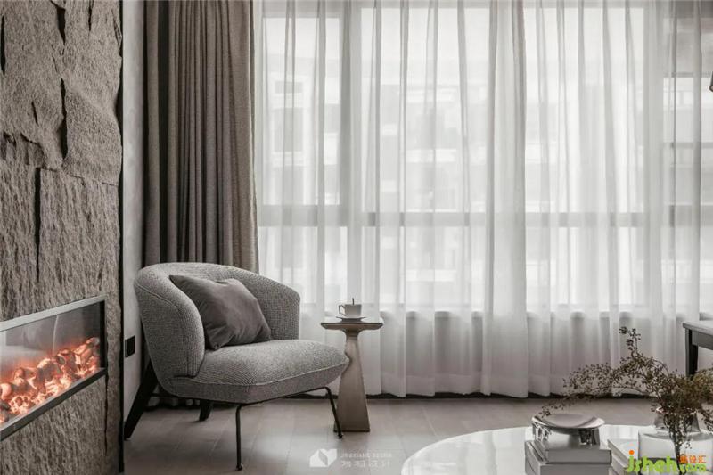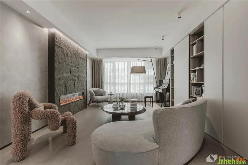 The space variation breaks the traditional layout of the living room. The art wall is made at the original TV background wall, and the fireplace below has a European retro style. The space is warm with fireworks.