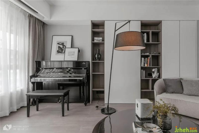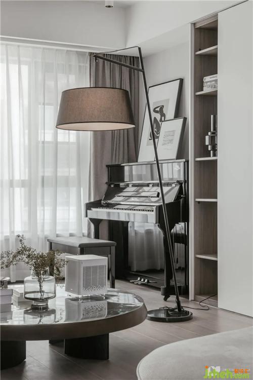 The whole wall custom cabinet is combined with hiding and exposing, and the piano placing area is reserved near the balcony, which makes the space more neat and unified.