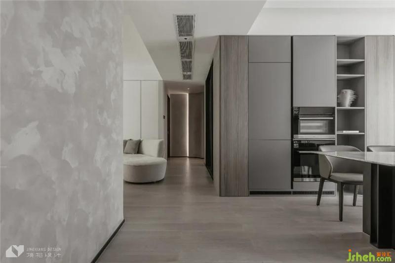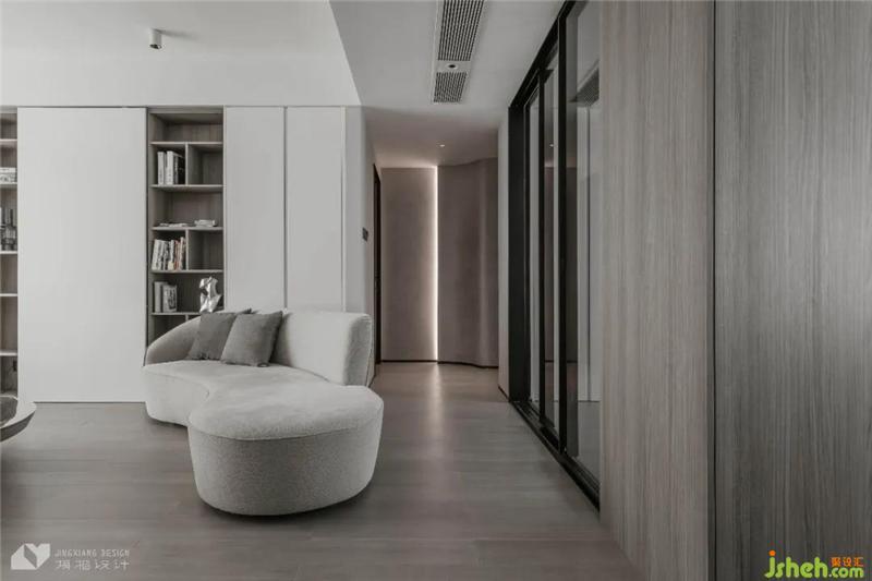 從客廳踏入走廊,隱藏?zé)魩Т蛟斐鲆姽獠灰姛舻纳衩乜臻g??臻g轉(zhuǎn)角做出弧度,弱化銳角的冷硬呆板。頂部以隱藏筒燈作為照明裝置,神秘浪漫空間中多了朗闊軒敞。