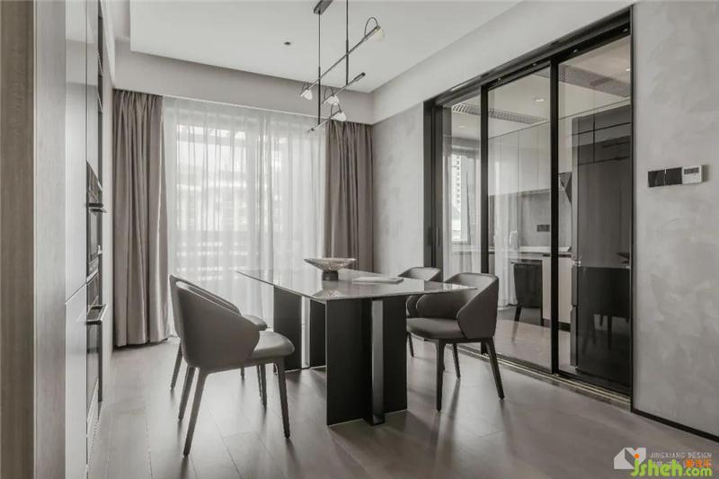 餐桌引領(lǐng)餐廳空間視覺焦點(diǎn),超薄大理石臺(tái)面上花紋點(diǎn)綴,空間通透自然會(huì)呼吸。深圳家居設(shè)計(jì)四把餐椅兩兩對(duì)應(yīng)擺放,一家三口圍坐用餐溫暖愜意。餐椅的高靠背設(shè)計(jì)契合人體閑坐時(shí)的身體曲線,用設(shè)計(jì)守護(hù)好家人身體健康。餐廚空間以玻璃移門隔開,空間更顯素凈澄明。