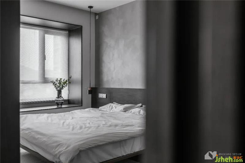 床頭設(shè)計(jì)置物臺(tái),代替笨重床頭柜,功能不減,視覺(jué)卻更顯輕盈。上方預(yù)留插座盒開(kāi)光,方便使用小電器,冷調(diào)空間中不乏人性化考慮。一盞小吊燈,讓睡前看書沒(méi)有背光煩惱,照亮床頭之處,也照亮心靈一角。