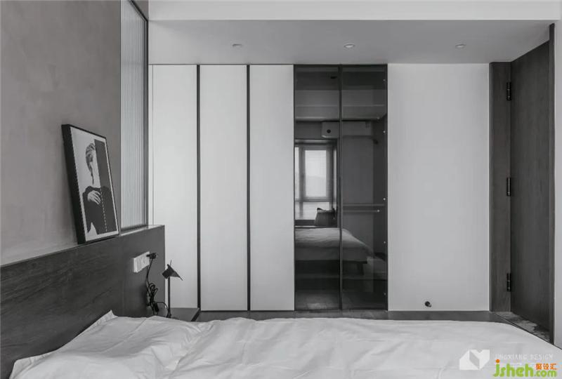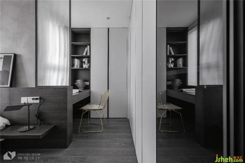 The original small balcony into the master bedroom, layout through the top lockers, and according to the spatial form of the natural extension of a simple desk, easily create a reading and office area.