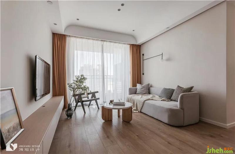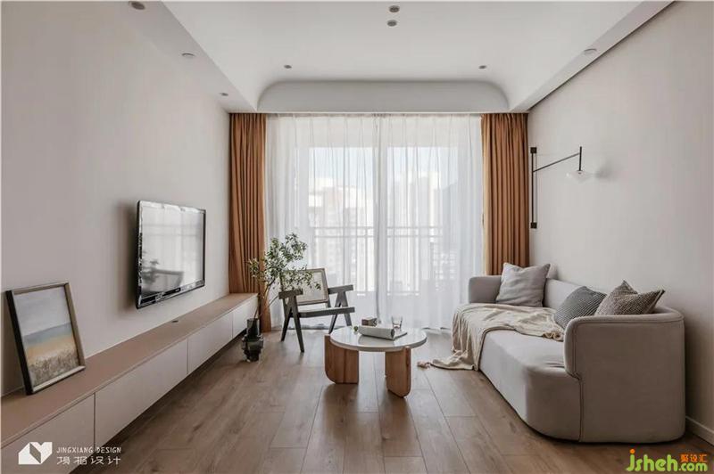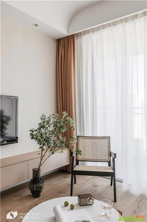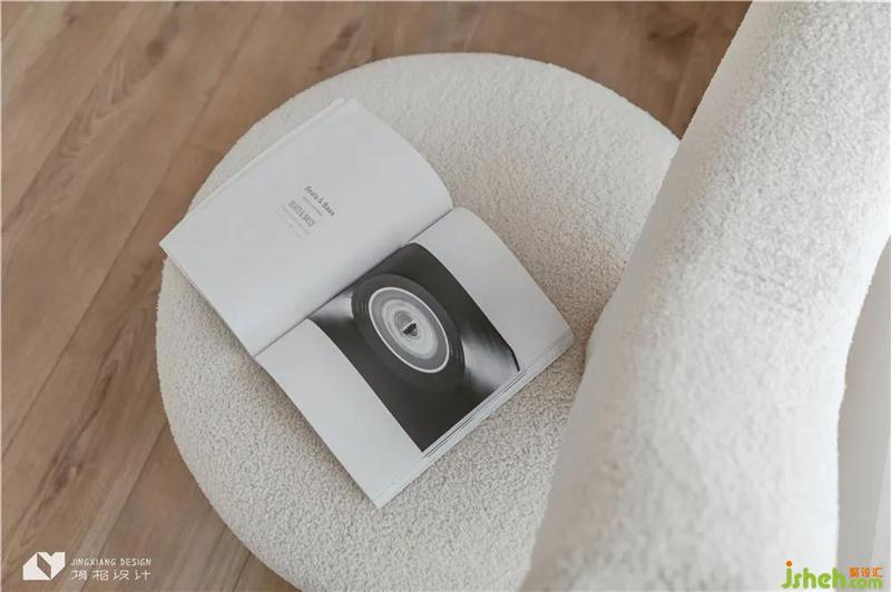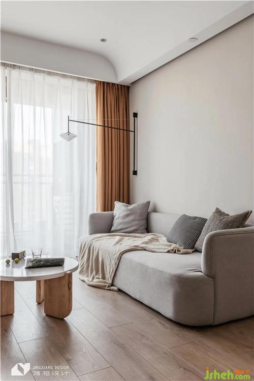 The ceiling of the living room is curved at the corner. The smooth arc echoes with the emotion transmitted by the log and plain white, and the space is quiet and peaceful. The appearance of sofa is also mixed with mild arc, and the spatial integrity is more prominent.