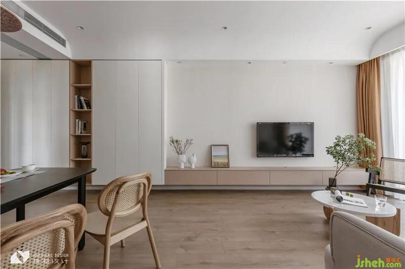 The entrance area, dining room and living room are connected, with white and logs as the dominant color of the space, occasionally dotted with a touch of black. The space shows a pure and clean appearance, and the overall tone is warm and natural.