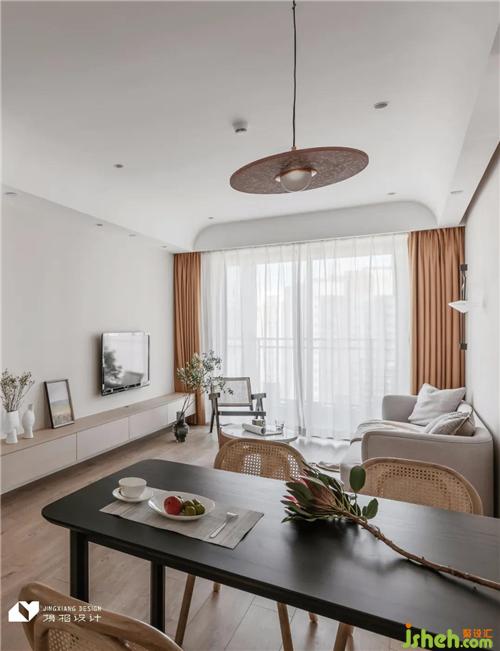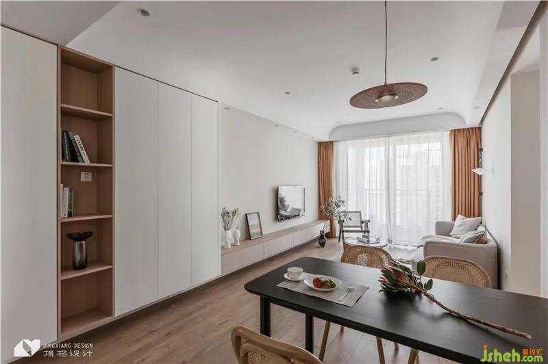 入戶區(qū)、餐廳、客廳連通,以白色和原木為空間主導(dǎo)色,間或點(diǎn)綴一抹黑色,空間展現(xiàn)出純粹干凈的外觀,整體基調(diào)溫馨自然。陽臺(tái)與客廳以通透玻璃移門隔開,溫暖陽光落入室內(nèi),客餐廳敞亮又溫柔,讓工作時(shí)緊繃的神經(jīng)在歸家的一瞬間得到放松。