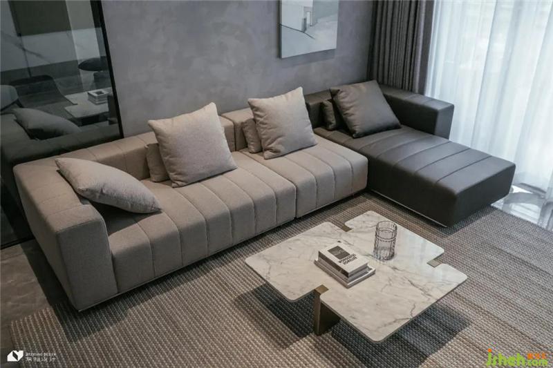 The carpet with bright texture and sharp stripes creates a sense of hierarchy for the living room. The decorative edges and corners on the combined sofa are regular, which echoes with the shape of the small table.