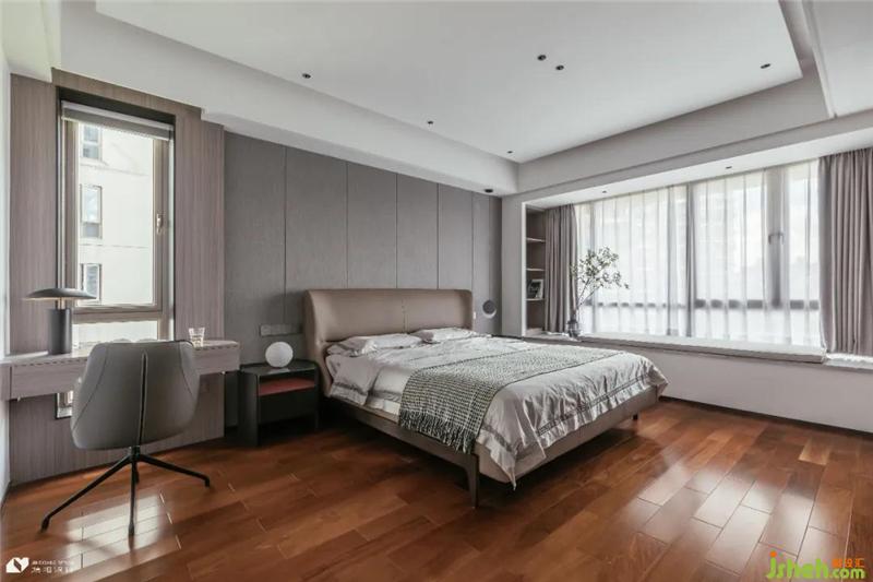 深色木地板自帶古樸優(yōu)雅氣質(zhì),與溫柔莫蘭迪色家具對(duì)撞出時(shí)間靜止領(lǐng)域,打造純粹干凈、溫婉繾綣的睡眠空間。