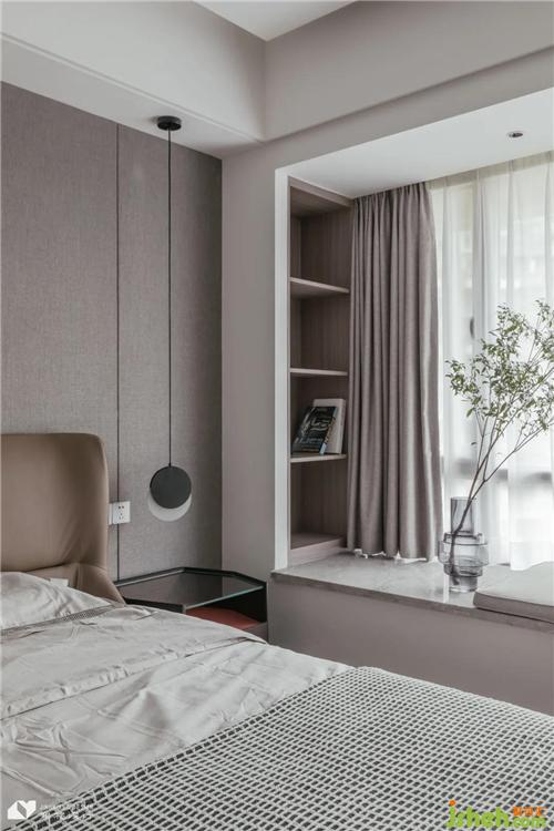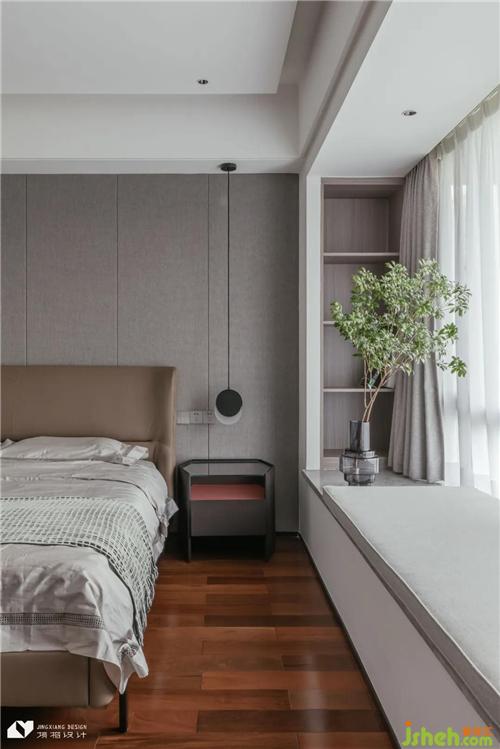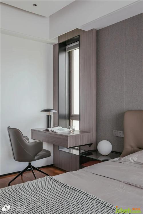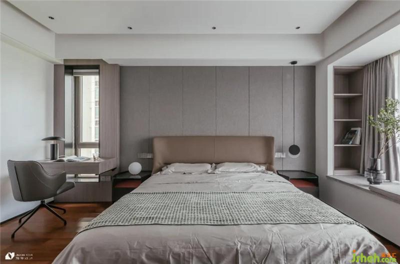 主臥以簡(jiǎn)約的家具和靜謐溫馨的色調(diào)做主導(dǎo),莫蘭迪色床具呼應(yīng)灰調(diào)背景墻,床頭小窗處裹上一層原木,進(jìn)而延伸出一方書桌,“生長(zhǎng)”于墻面的書桌讓空間有了更為統(tǒng)一的視覺觀感。