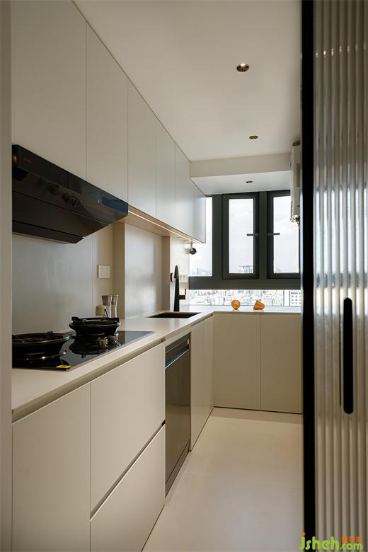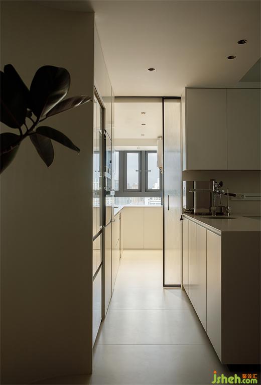 原本的廚房特別小,不足以滿(mǎn)足日常生活所需。境相設(shè)計(jì)師將原廚房外移一點(diǎn)作中廚使用,原餐廳處增加西廚與中廚連接搭配使用,一扇移門(mén)靈活切換。