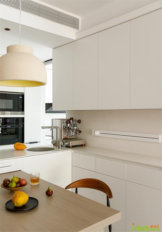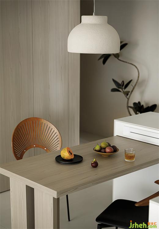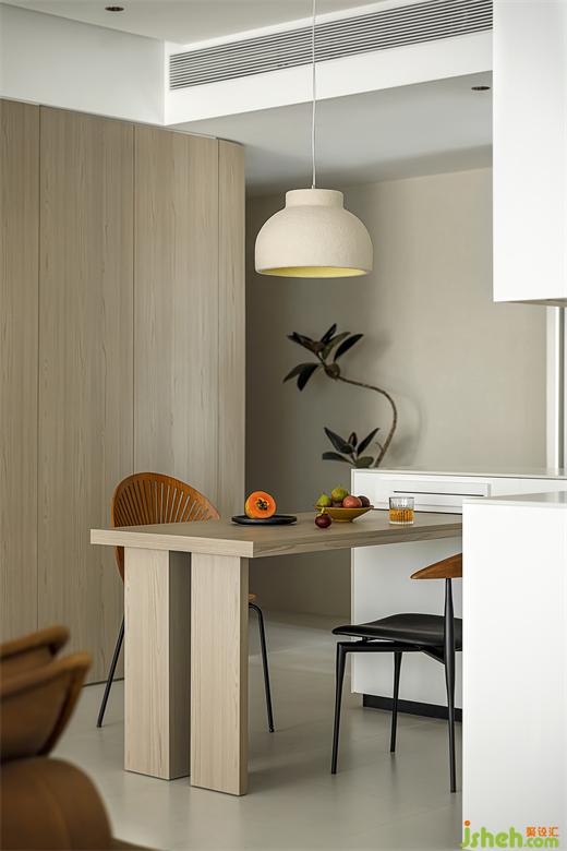 境相設(shè)計(jì)在餐廳增設(shè)水吧臺(tái),添加西廚功能;餐桌搭進(jìn)島臺(tái)可拉可伸,家中來客人時(shí)也能夠容納多人使用。