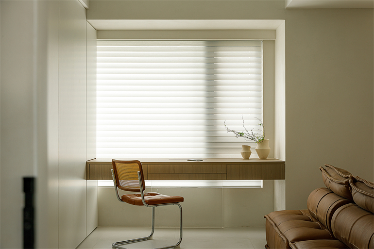 3、次臥兩側(cè)墻體拆改為開合自由的移門,動線自由,空間感得到最大限度延伸,移除室內(nèi)飄窗改為書桌,靠墻高柜嵌入墨菲床,滿足臨時留宿,次臥功能復合,利用率最大化。