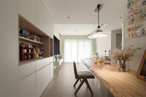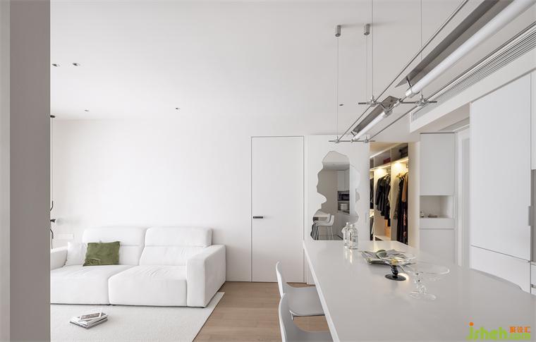 “我的夢中情屋是干凈清爽的,還要有間寬敞的主臥和大大的衣帽間?!蔽葜髟谙蛭覀冩告傅纴硇录业男枨髸r,這樣說道。結(jié)合屋主的個性,我們以極簡純白的形式表現(xiàn)家的外在風格,并加入靈魂元素的暖調(diào)燈光,讓家在純粹無暇與溫暖舒適間來回切換。
