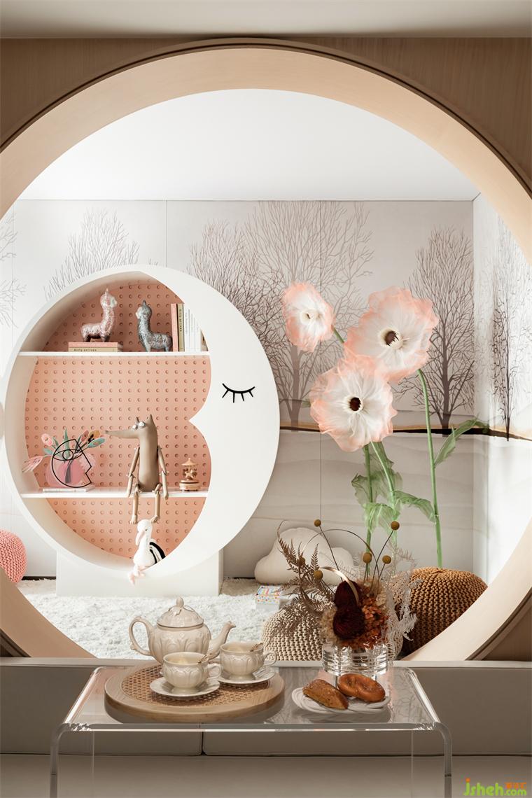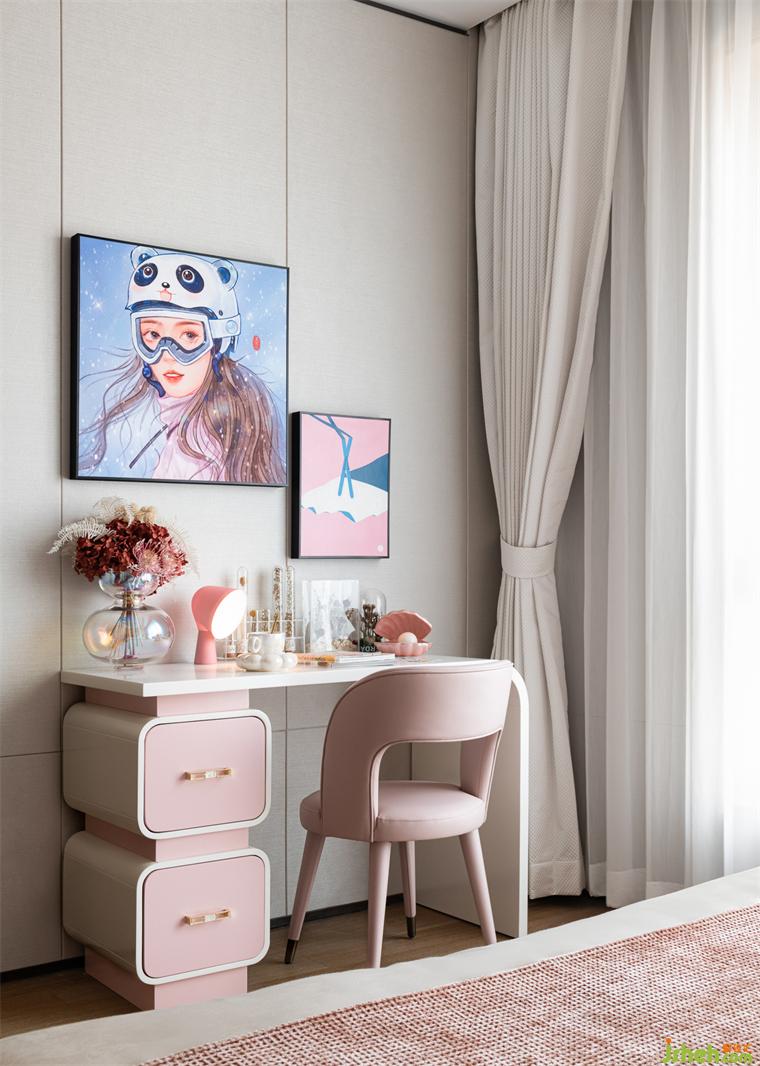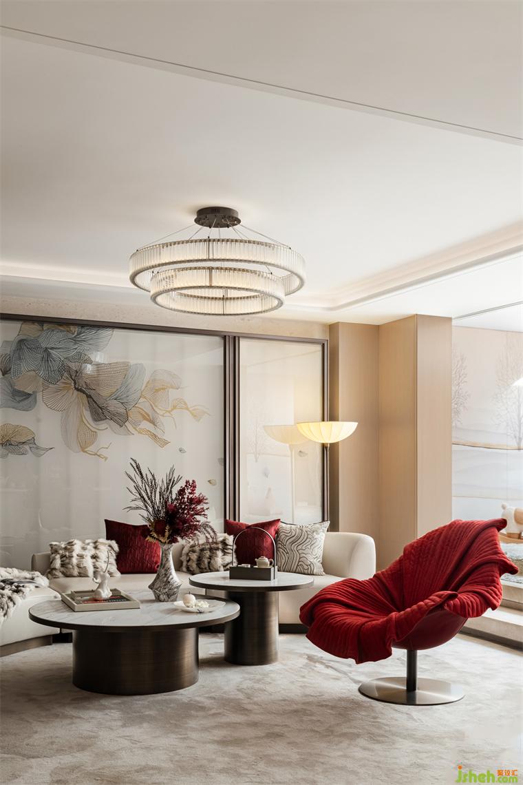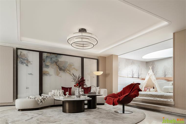 女主人空間在沙發(fā)背景植入玻璃屏風(fēng)如點(diǎn)睛之筆,空間的風(fēng)雅意蘊(yùn)鋪滿,傳遞出現(xiàn)代與中式氣韻,樣板房設(shè)計(jì)營(yíng)造了自洽怡然的居家氛圍。