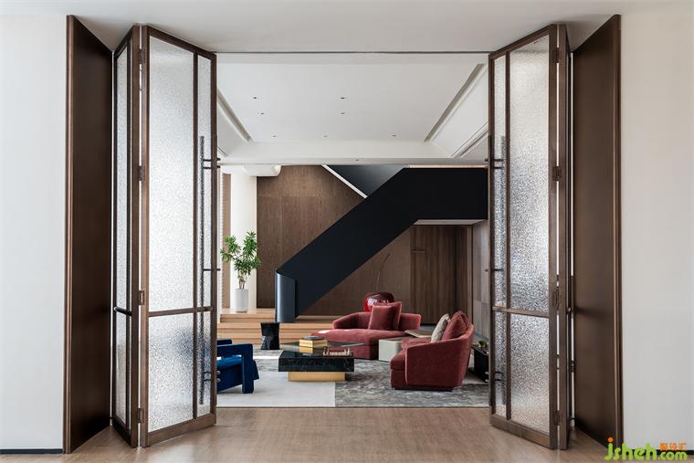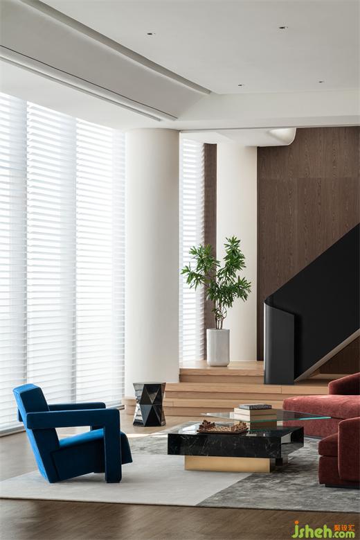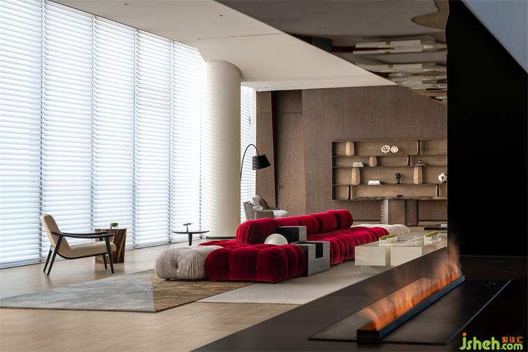 交流區(qū)是解構(gòu)主義在現(xiàn)代背景下的拼貼;凝固的扶梯和藝術(shù)品構(gòu)建出連貫的視覺語言;沙龍區(qū)可以360度使用的模塊沙發(fā)以鮮明的色彩激活了連貫場景的氛圍;餐區(qū)懸吊的照明裝置與內(nèi)部呼應(yīng),功能與藝術(shù)地結(jié)合一以貫之。
