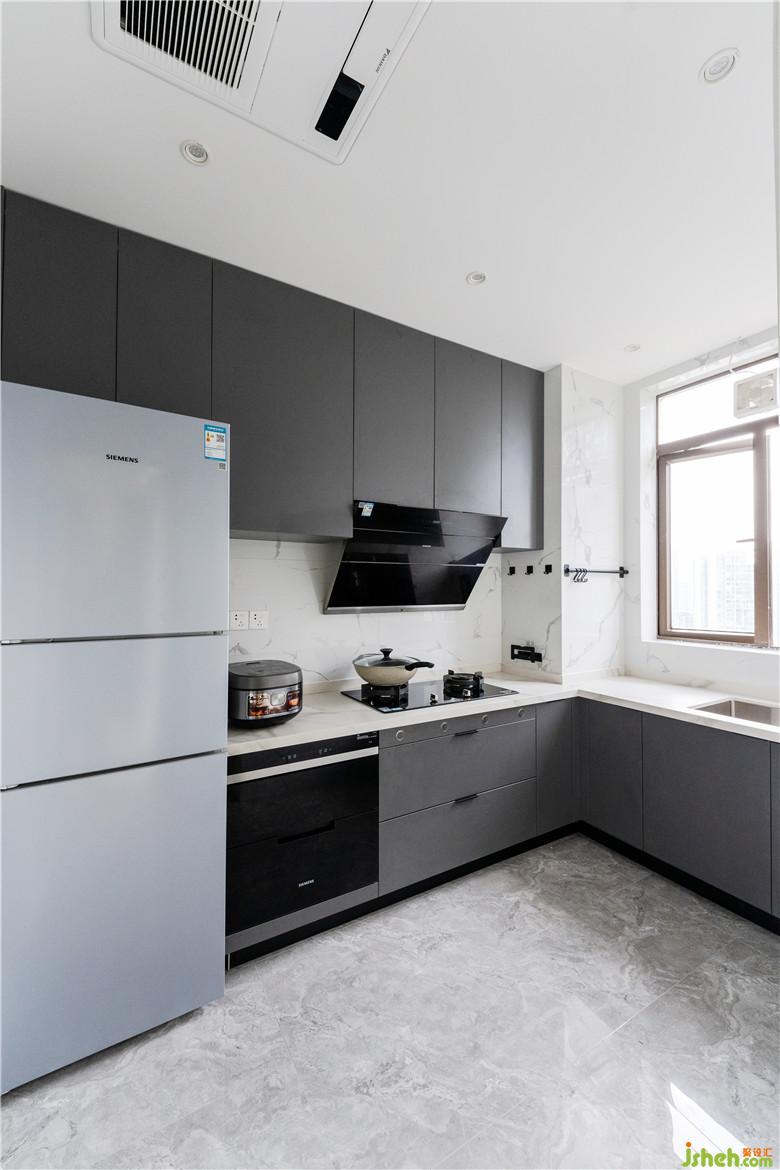 廚房基本上被承重墻包圍住,所以難以改動(dòng),維持L字型格局,那我們就從材質(zhì)上做改變,以灰調(diào)與外邊的空間形成呼應(yīng),讓整體更加的連貫。