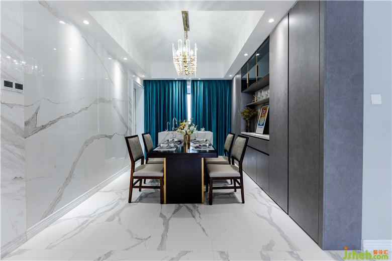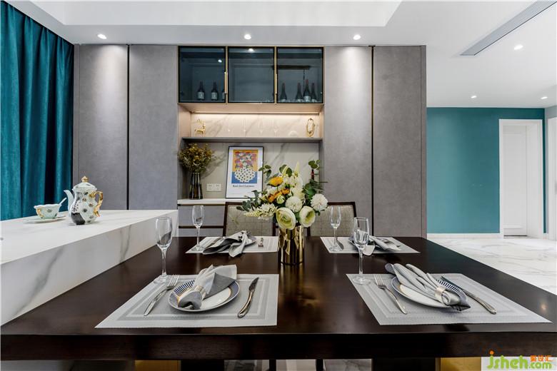 要說起整個(gè)空間Johnny最喜歡的是哪個(gè)區(qū)域,那定是餐廳空間區(qū)域。餐廳的島臺(tái)設(shè)計(jì)盡顯大戶型的大氣時(shí)尚,依舊使用大理石材質(zhì)作為呼應(yīng),餐邊柜選用了愛格板水泥紋理的柜門板,灰色調(diào)的柜子與窗簾綠色墻面的綠色碰撞,不自覺間產(chǎn)生一種高級(jí)感。