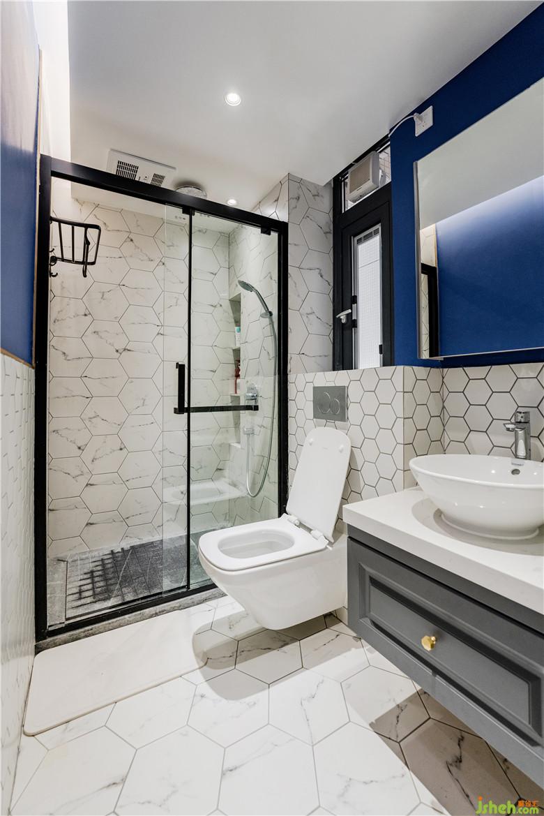 衛(wèi)生間異?;钴S有木有!區(qū)別以往的衛(wèi)生間,Johnny哥用大色塊藍色調去提亮衛(wèi)生間,腰線以上是藍色腰線一下式六角磚鋪貼,莫名的復古feel。入墻式排水的馬桶上方還可以放置小物件呢!雖說整個衛(wèi)生間空間都是六角磚,但是干濕分區(qū)用的是兩種尺寸規(guī)格的六角磚,無形中就區(qū)分開來了。