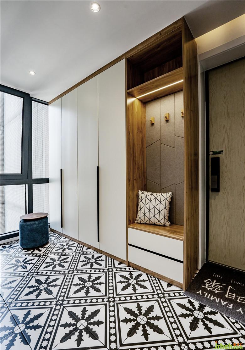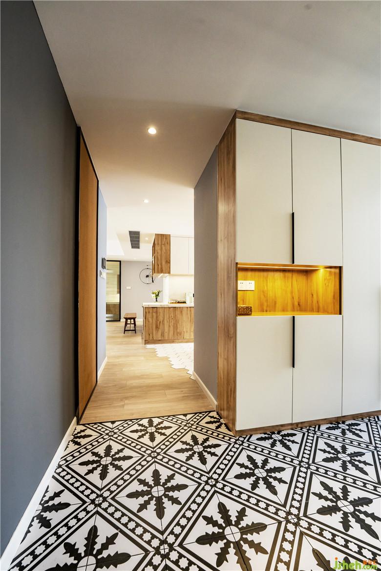 在玄關處的設計中,Johnny哥從墻面結構入手,延伸廚房墻體,如此,就得到一個開放式玄關儲物區(qū)啦~簡潔到頂的壁龕儲物柜配以花磚的鋪設,讓這個儲物間更為有趣!壁龕處平時放放鑰匙也是方便得很。