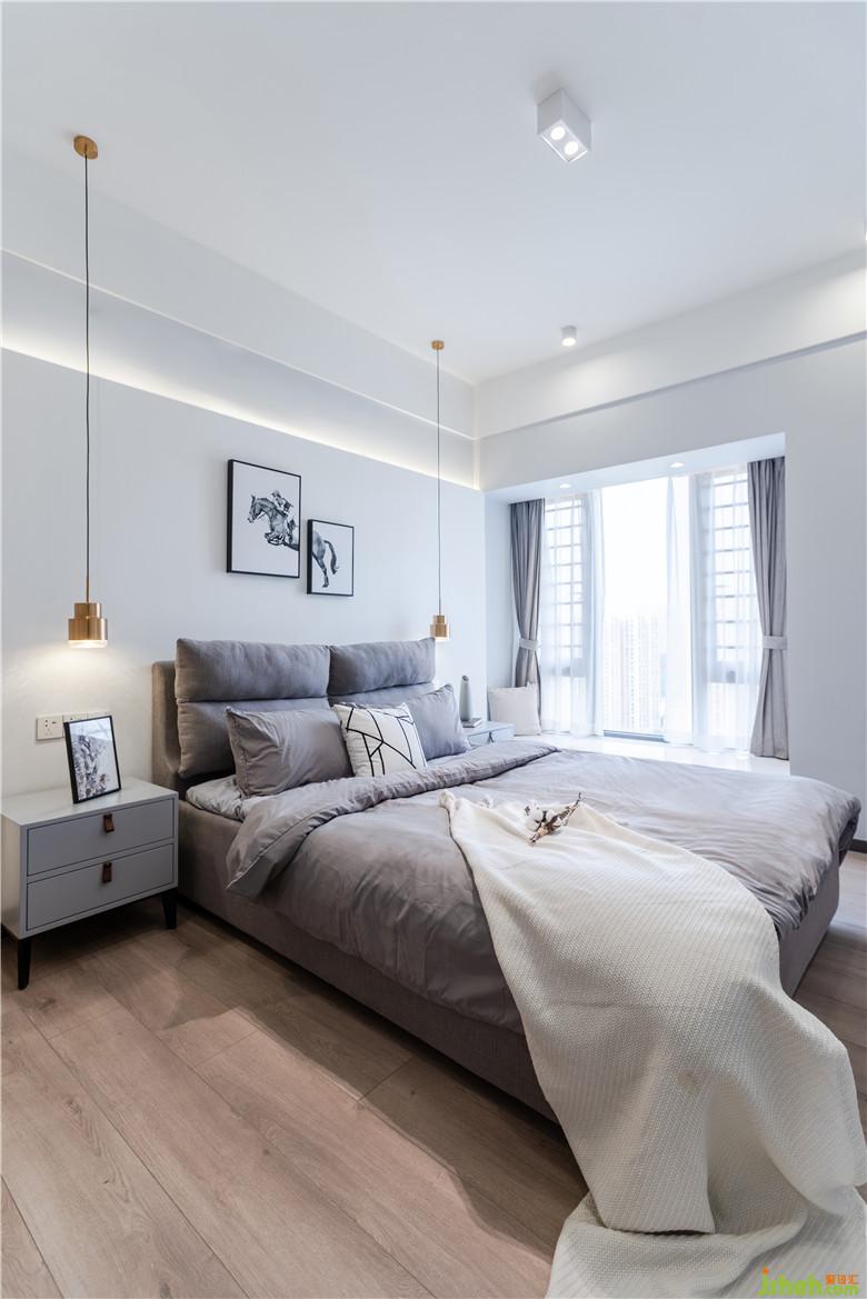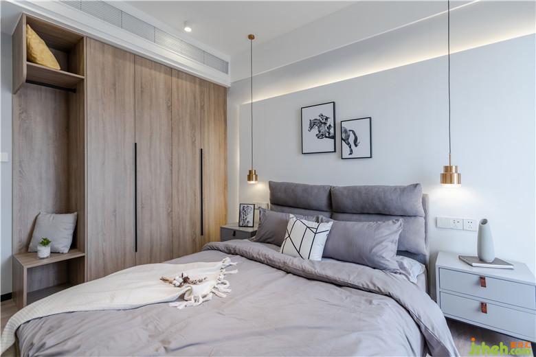 金屬元素與冷靜的色彩碰撞出奢華感。掛畫在床頭上溫潤而有力地展現(xiàn)著獨(dú)自的活力,到頂衣柜依舊與客餐廳的板材基材相襯托。