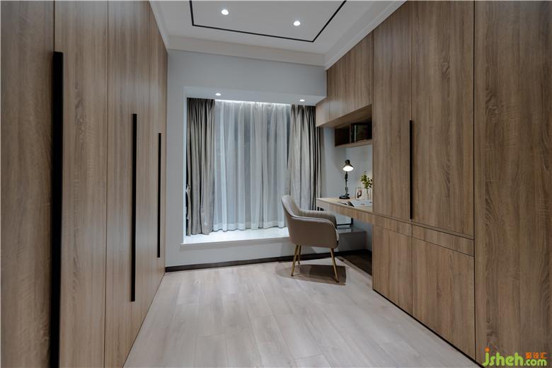 衣帽間與書房自然融合,兩者都是不經(jīng)常用到的區(qū)域,將兩者結(jié)合既能用作休閑區(qū)域有能做為實(shí)用區(qū)域。其家具物件選以皮質(zhì)與木材搭配純靜簡潔的空間,詮釋出空間力求自然極簡的調(diào)性。