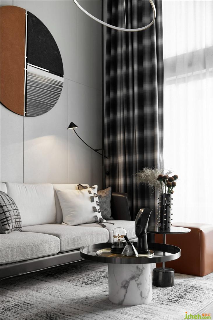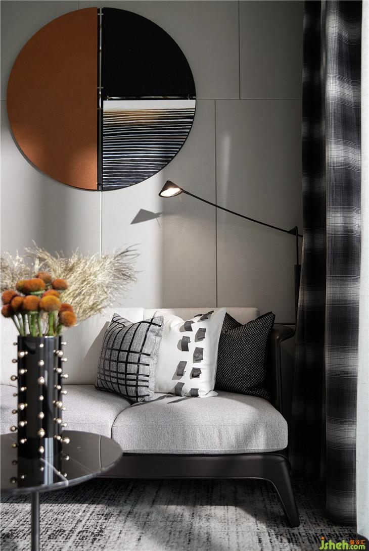 無論是靈動光圈的燈飾,抑或充滿層次感的茶幾,窗簾上的格紋,甚至是花瓶上的鉚釘,都是卸下中規(guī)中矩這個枷鎖的利器。赤茶色掛畫、掛飾與坐凳的加入緩和了強烈的個性,注入溫潤的氣息。