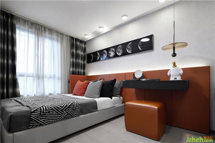 客臥將大色塊與不同紋理的圖案調(diào)和得相得益彰,舒適簡(jiǎn)潔。設(shè)計(jì)師把金屬光澤蔓延到了這里,與客廳風(fēng)格遙相呼應(yīng)。