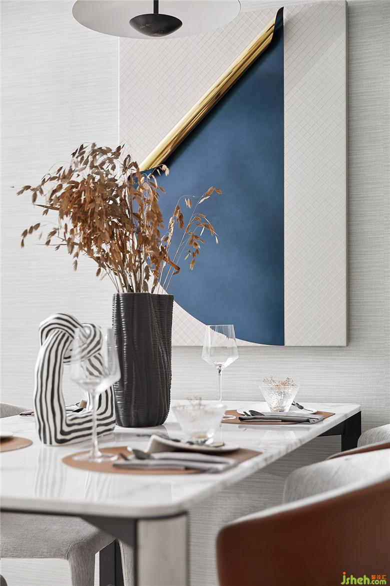 客廳空間褪去浮華的裝飾,以素白與雅灰為主,小面積的咖色與藍色帶起節(jié)奏感。從陶藝文化中萃取而來的元素,化為各種性格鮮明的線條、形狀和肌理,充斥在空間的細節(jié)處。藝術與生活的邊界在此彌散,營造出靜謐而有格調(diào)的閑適光景。