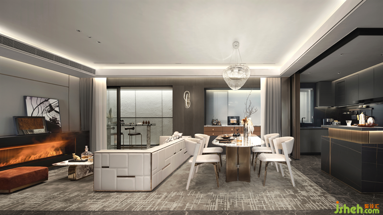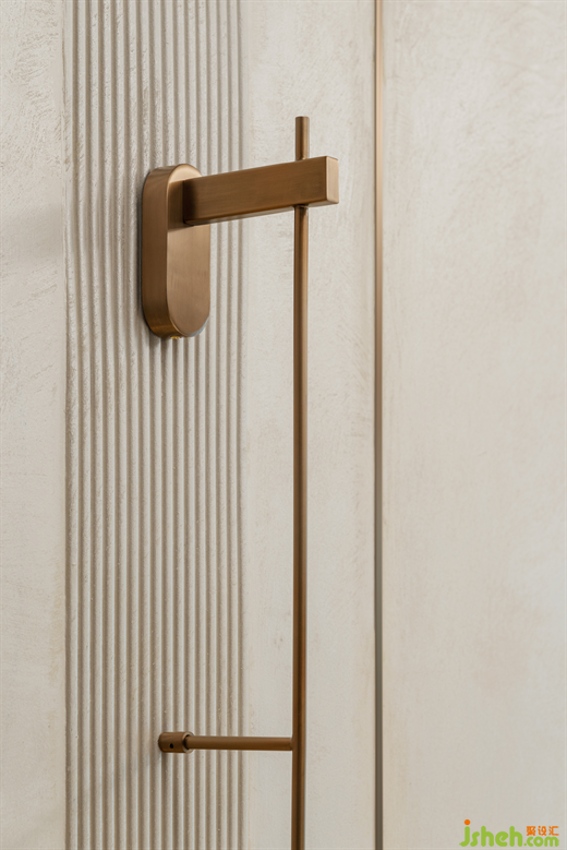 櫥柜打破傳統(tǒng)柜體皆安裝在天花以下的做法,利用燈槽的預(yù)設(shè),結(jié)合燈帶,樣板房設(shè)計營造一種直沖“云霄”的高闊感。廚房采用半開放式設(shè)計,令空間更加舒展之余,與餐廳的聯(lián)動性得以拉近。餐桌與島臺形成一體,組合使用,即構(gòu)成頗具浪漫情調(diào)的一角,滿足小酌怡情的待客所需。設(shè)計師擅用場地條件,將超大的飄窗改裝成餐邊柜,不僅可以承載收納、小吧臺的功能,亦與餐桌、島臺圍構(gòu)成一個整體的生活能量場域,鋪敘更具煙火氣的真實場景日常。