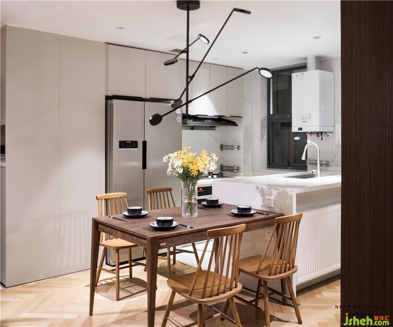 廚房改成開(kāi)放式廚房,增加島臺(tái)餐臺(tái),使餐廳廚房一體化。