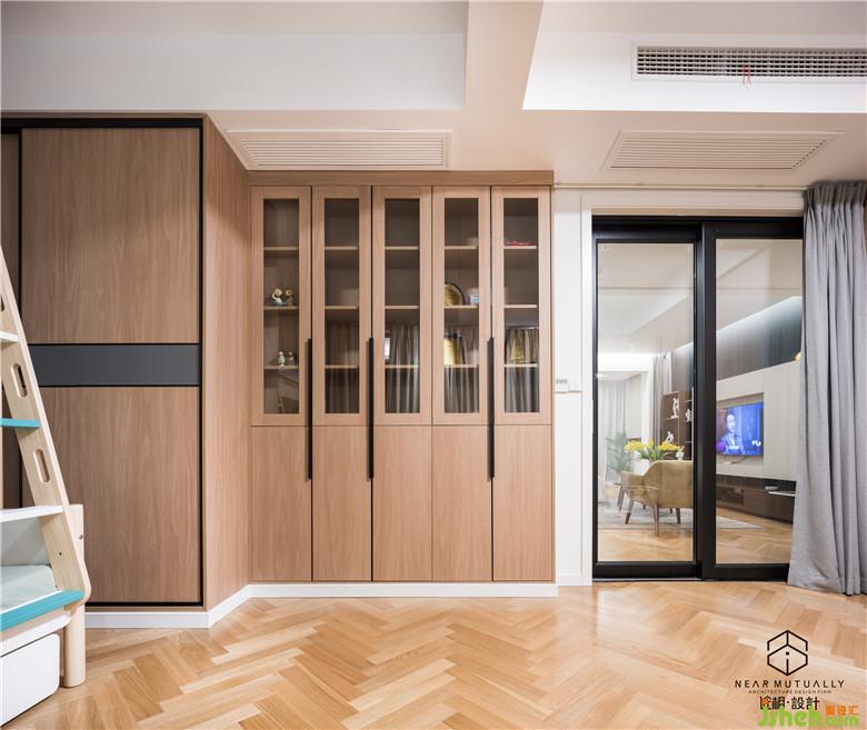 原有結構使小三房,室內(nèi)設計師通過把書房與小孩房打通,做成一個房間,同時沿著墻邊做儲物柜,增大了房間,以后小孩也有獨立的玩耍和活動空間,同時用玻璃移門作為墻使空間變得通透,增加了互動性,以后小孩在房間里活動,父母也能隨時注意得到。