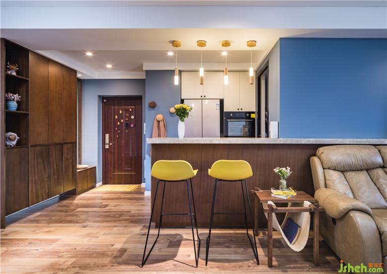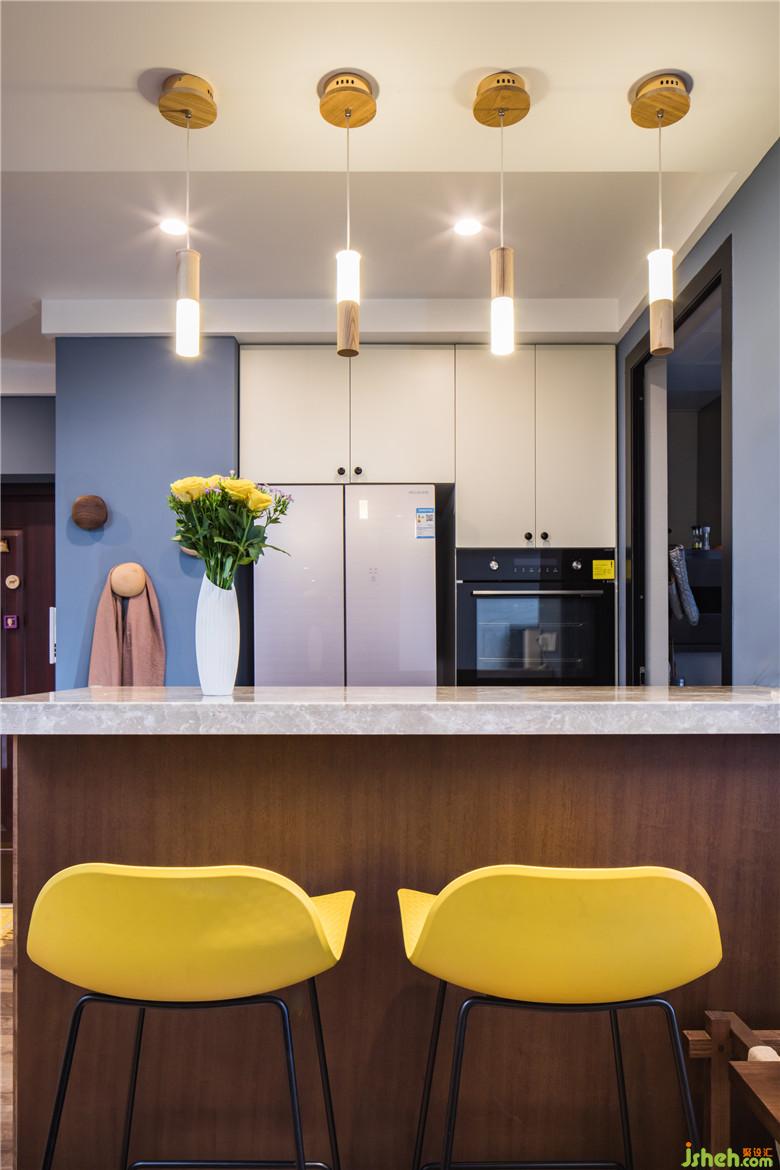 廚房陽臺取消,作為中廚一部分,并把廚房分為2部分,外面設(shè)置了吧臺,烤箱蒸箱位置,里面又個獨(dú)立的中廚。入戶靠右邊的廚房墻面拿掉后,整個進(jìn)門視野變得也開闊了,同時增加了采光。整個廚房與廳里的互動性也曾強(qiáng)。