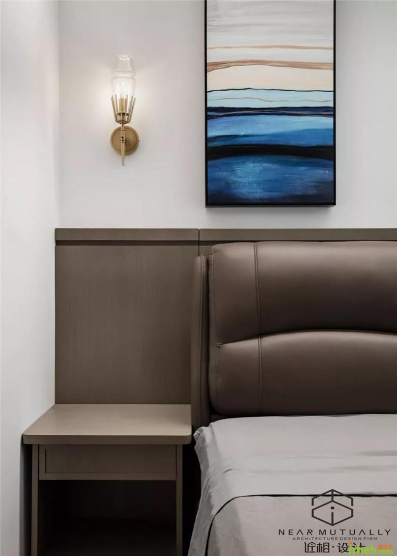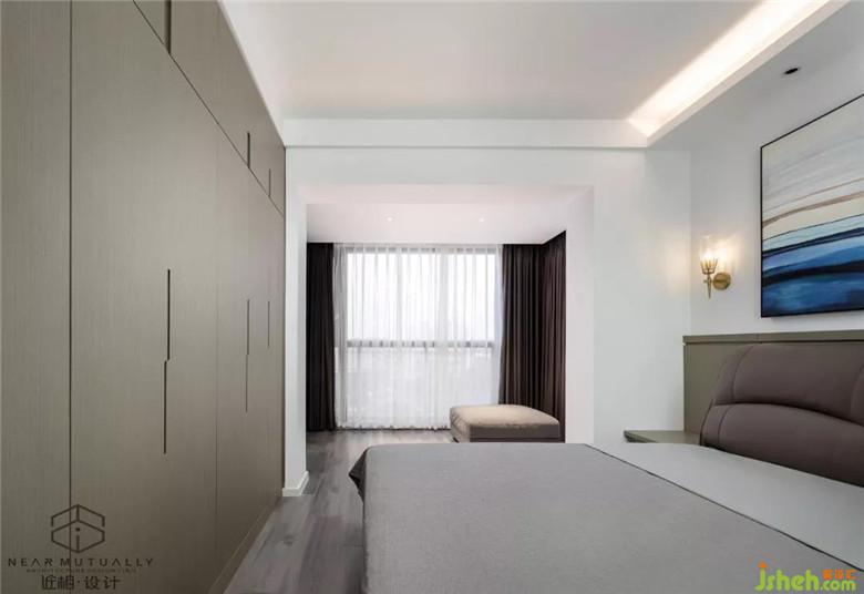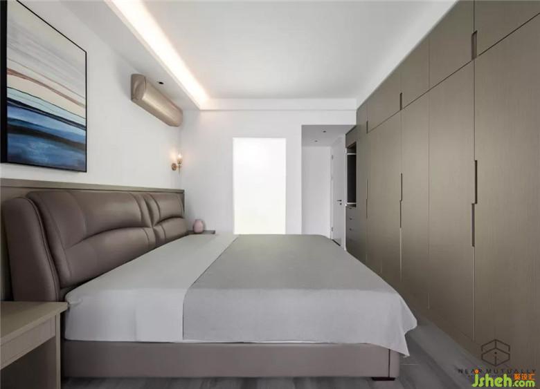 主臥原本空間較小,在衛(wèi)生間改動(dòng)后顯得更小。因?yàn)樵娟?yáng)臺(tái)較大所以在設(shè)計(jì)上把陽(yáng)臺(tái)通過(guò)移門(mén)一分為二,一邊作為生活陽(yáng)臺(tái),一邊作為主臥部分。
