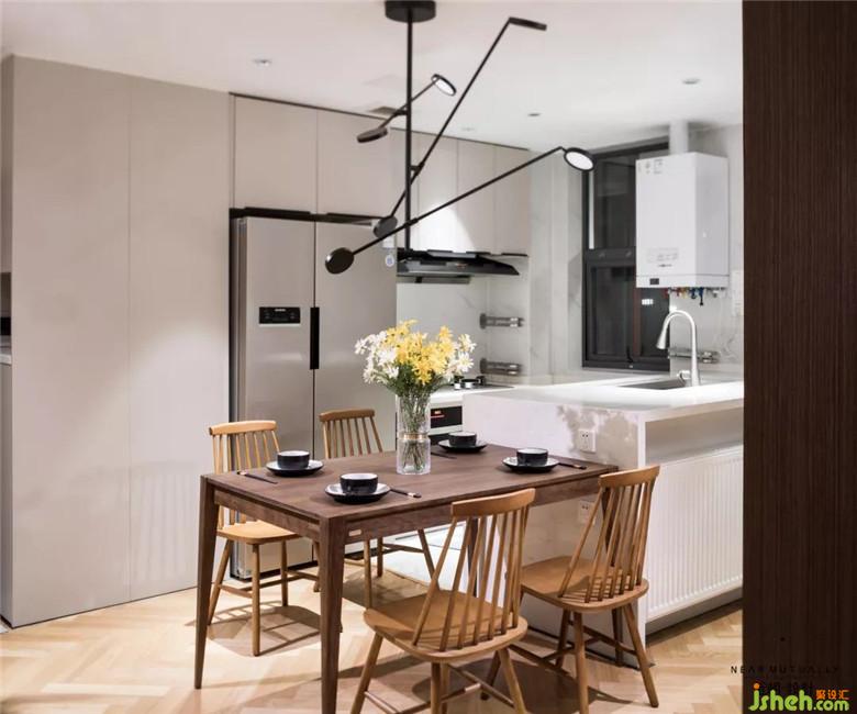 增加島臺(tái)餐臺(tái),使餐廳廚房一體化,讓空間使用得以物盡其用.