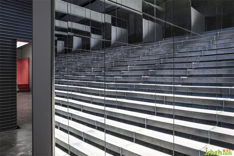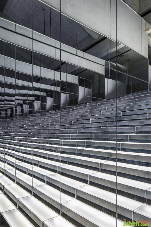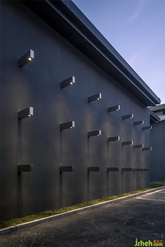The SouthFa?ade iscovered with a matrix of 54 steel light boxes. These protruded rectilinear structures cast an array of shadows onto the grey stucco wall. The angle and the lengths of the shadows constantly change throughout the day according to the solar position. Downlights are also embedded into the box to light up the fa?ade creating another kind of pattern during the nighttime. These structures can also be used to hang large posters or displays that may be required by the museum for different events.