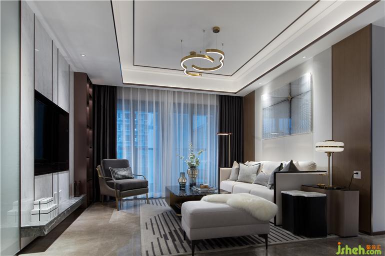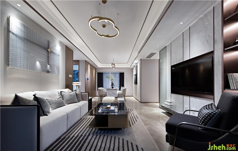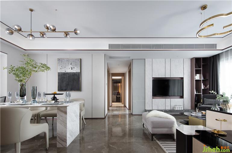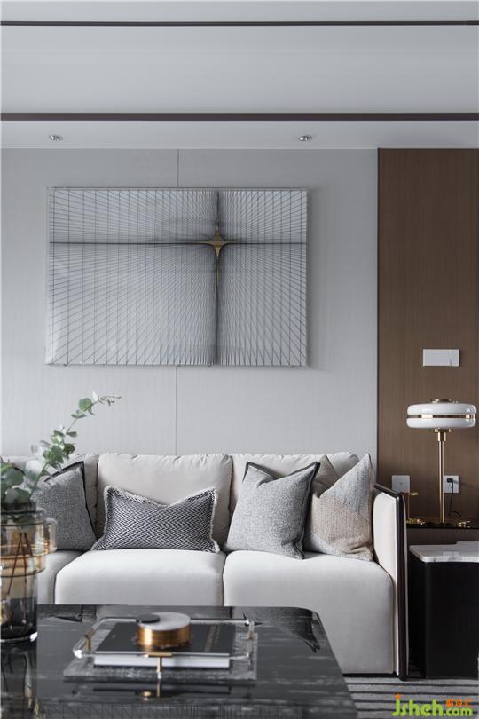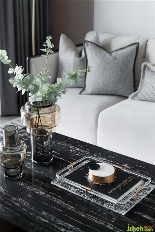整體空間以干凈利落的灰白色調(diào),鋪敘沉穩(wěn)安寧的氣息,布藝、金屬、大理石、皮質(zhì)等多種元素的碰撞,又為空間增添一份精致獨特的美感。