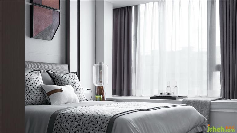 主臥空間摒棄繁雜的設(shè)計,運用淡雅的色調(diào),融合玻璃與布藝元素,調(diào)和出寧靜溫雅的居住氛圍。