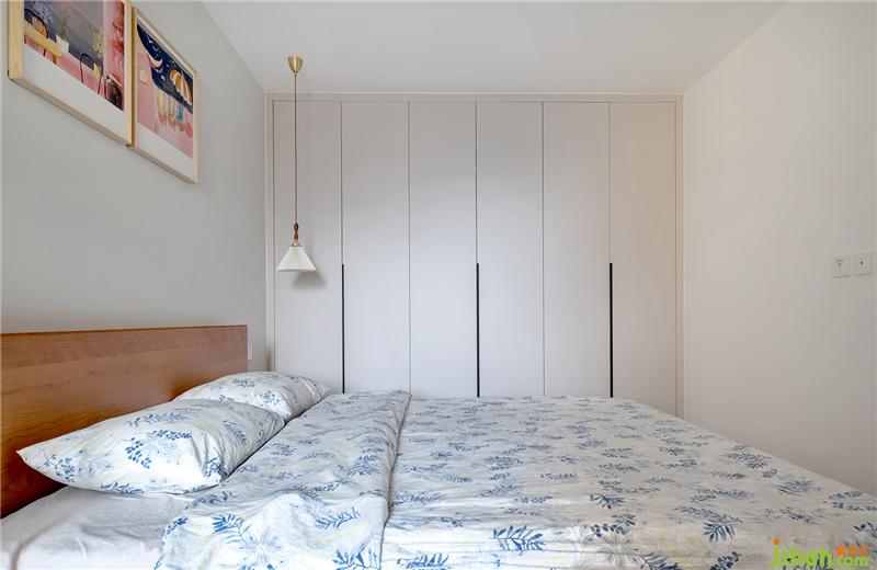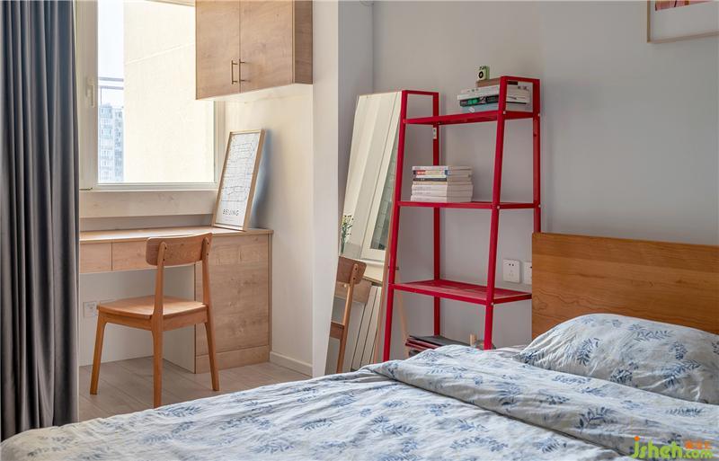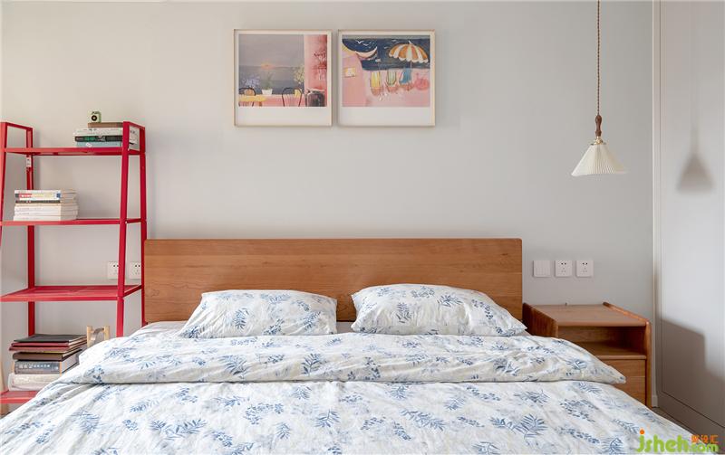 在床頭擺放了一組紅色的書柜,地臺床頭柜,還讓收納翻倍。