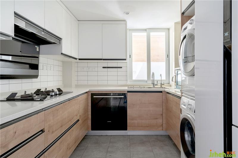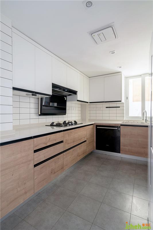 廚房墻面小白磚讓整個空間更加的白凈,地面深灰色瓷磚,平衡了沉穩(wěn)的效果。白色的吊柜與原木底柜搭配,簡單自然。