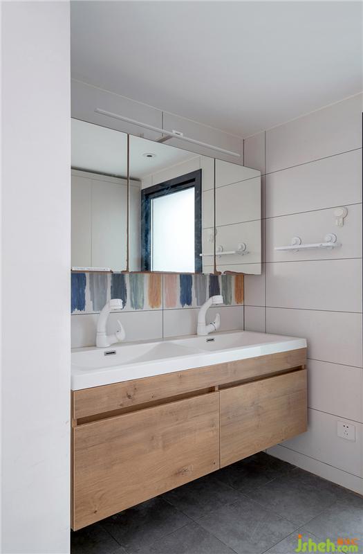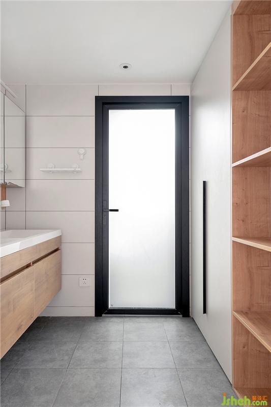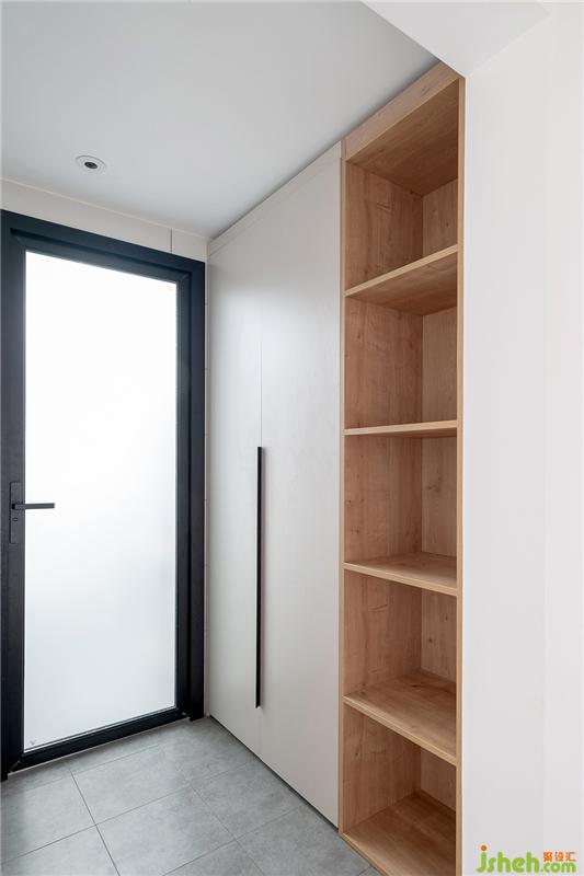 衛(wèi)生間入口區(qū)域做了一組儲物柜,擺放全屋的清潔用具。柜體沒有全封閉,局部做了開放格,可以隨意更換衣物,擺放浴巾等生活用品。