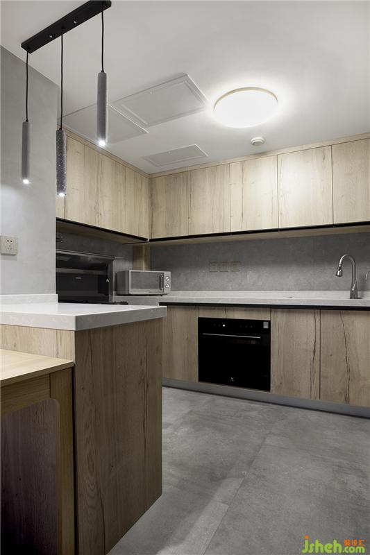 開(kāi)放式的廚房,原來(lái)在水盆的左上方是有窗戶(hù)的,但是基本沒(méi)有采光,所以干脆就堵上了,這樣吊柜也可以多一些,通風(fēng)不用擔(dān)心,家里安裝了全屋的新風(fēng)系統(tǒng)。