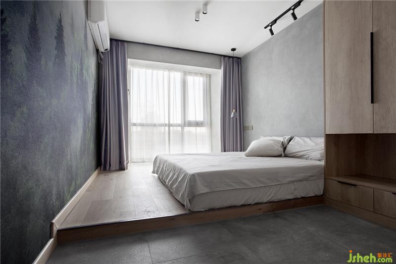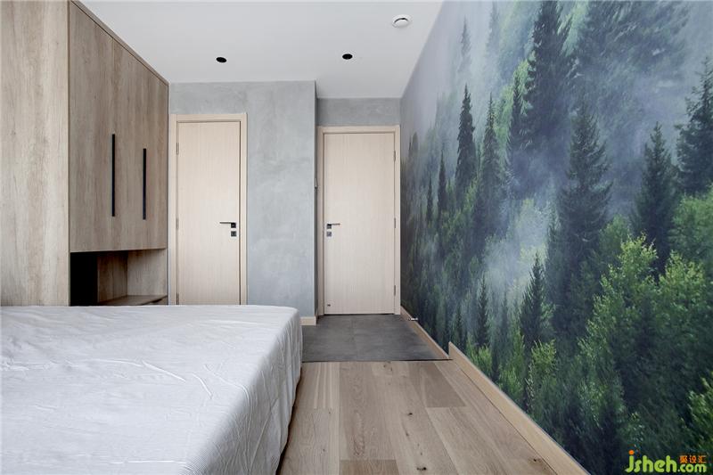 床正對(duì)面設(shè)計(jì)了一面森林壁畫(huà),加大了屋里的視覺(jué)感,同樣也提升了整體氛圍,大自然的魅力是永不過(guò)時(shí)的。