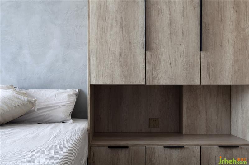 衣柜的設(shè)計(jì)同樣也是別有用心,挨著床的高度設(shè)計(jì)成落空的,首先這樣可以解決在床上隨手放置的物品,其實(shí)最重要的也是視覺(jué)上的,床頭這里不會(huì)因?yàn)檫@個(gè)通高的衣柜顯得壓抑。開(kāi)放格里放置了感應(yīng)的燈帶,起夜的時(shí)候也是一個(gè)夜燈的裝置。