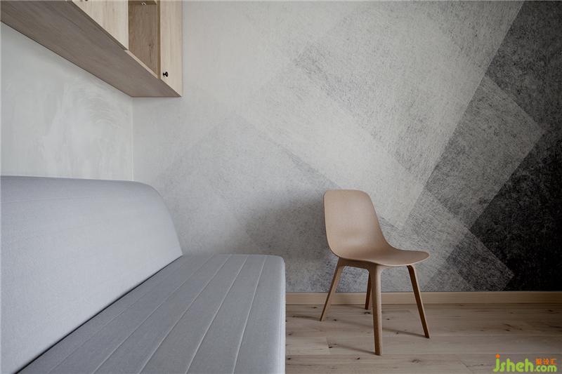 墻面用了幾何壁紙,更加符合這個(gè)空間的氛圍,沙發(fā)床可以隨時(shí)展開(kāi)使用。