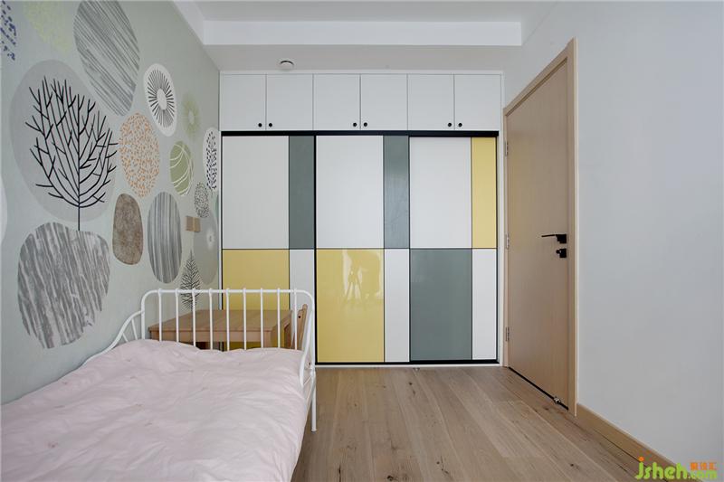 衣柜柜門用了色塊拼貼的方式來制作的,這樣和壁紙的色系相同,同樣也調(diào)劑了小空間的沉悶。