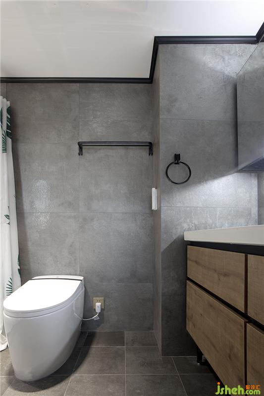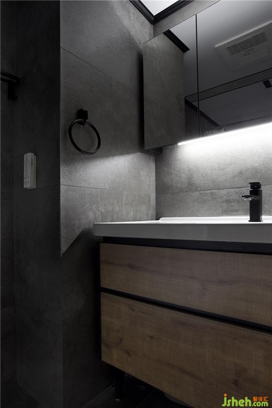 主臥的衛(wèi)生間墻面直接采用了大塊的水泥磚粘貼,質(zhì)感更勝小塊的拼貼。