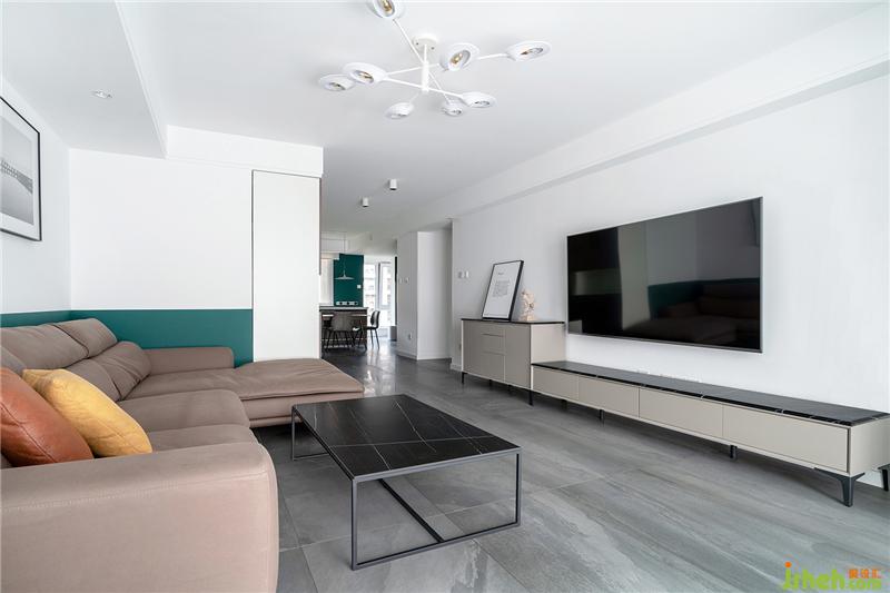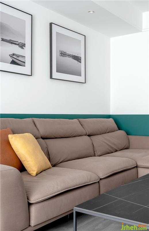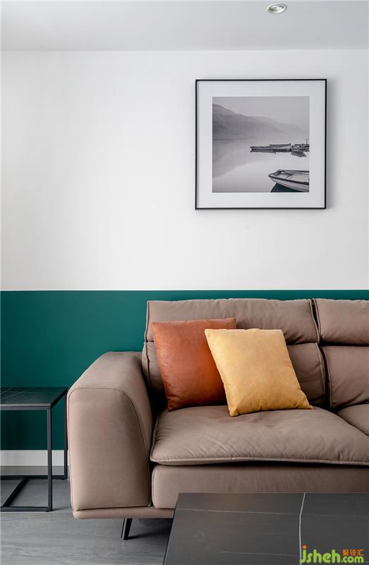 墨綠的半墻分隔,存在的意義不僅是作為空間的一個色彩點綴,同時它會在立面視覺上,把客廳背景橫向加長。因為它的存在就會把一整快墻,無形中分成兩個個長方形。原本簡單的背景,就會增添很大的空間感。