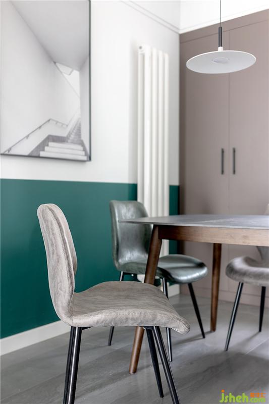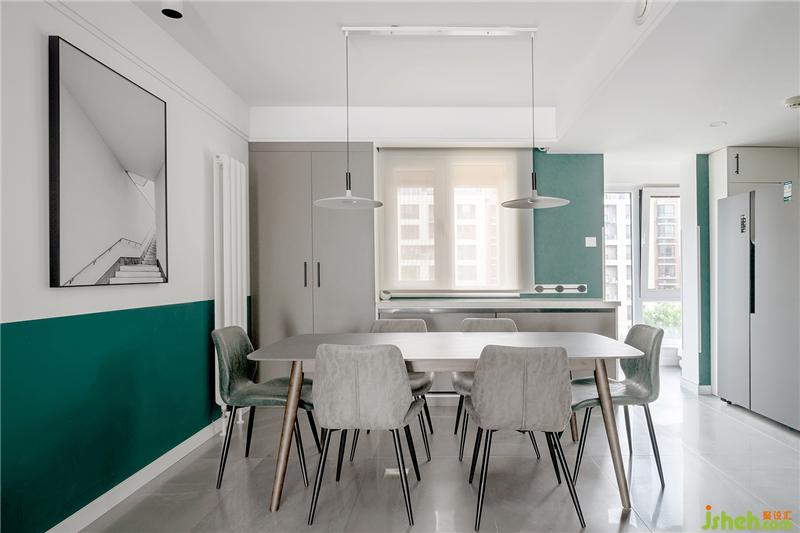 這個角度的餐廳空間感十足,簡約的吊燈和墻上的掛畫搭配起來,有一種簡單時尚的融合。